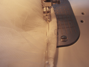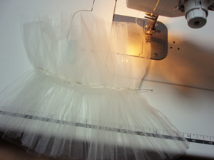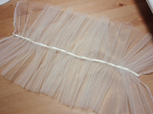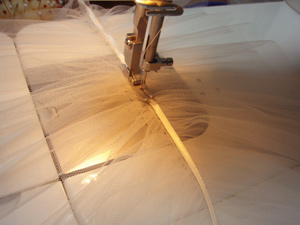 ギャザーの上に、サテンリボンを重ねてミシンをかけ、合体させます。