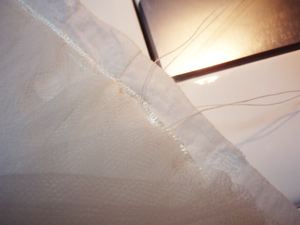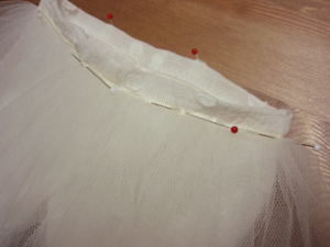 サテンリボンの上を縫っていきます。下側を縫い込んで、ウエスト口をふさいでしまわないように注意してください。