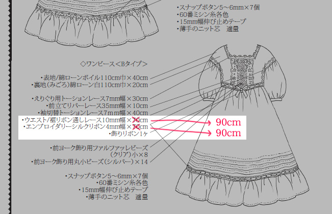 ↑上記の通り、ウエスト/裾リボン通しレースと、シルクリボンの用尺ですが、