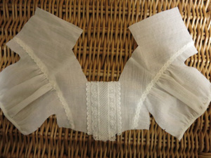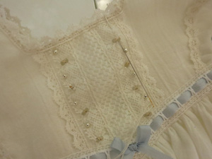 えりぐりには後からトーションレースを手縫いでつけてスカラップ状の飾りに。みごろのウエスト切替にもリボン通しレースをつけて、前中心に結びリボンをとめつけます。