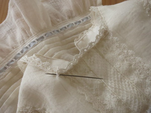 みごろと袖をつなげる段階で、袖の切替にトーションレースをつけ、前中心に両山のリバーレースとトーションレースを組み合わせて飾りのラインを入れています。
