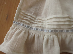 フリルとの切替位置に、シルクリボンを通したレースをたたいています。