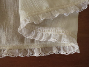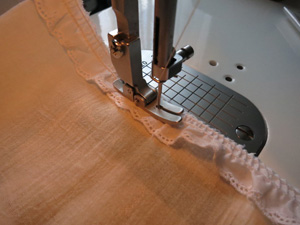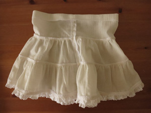 下段スカート前中心は、2枚を中表に重ねてぬいあわせ、ロックがかかっているぬいしろを割り、裾にギャザーレースを付けておきます。