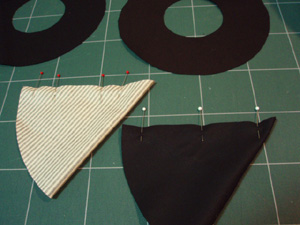 トップのパーツは中表の二つ折りにして、まち針でとめておきます。