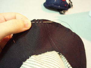 1ページ前の写真の状態そのままで、表地の帽子の上に裏地の帽子を重ねて、ブリムの周りをノッチを合わせてピンで止めます。