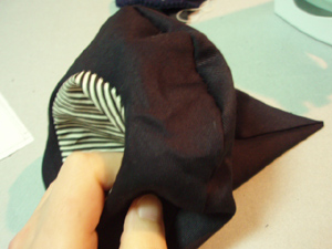 そして、トップの裏地にあけておいた穴から、表地を引っ張り出し、全体を表に返します。