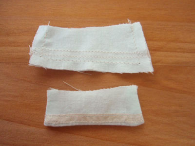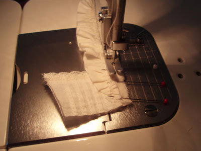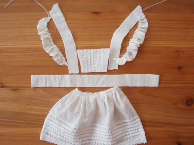 ↓胸当ては上端をぬい返しコバステッチをかけました。さらに上端にレースを付ける場合はここで。
