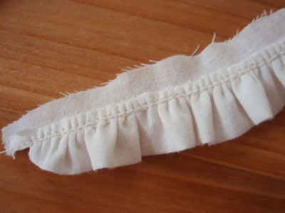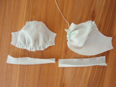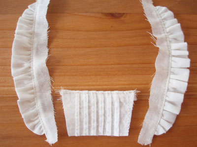 まずは各パーツを準備。フリルはバイアスに裁って、二つ折りしてカーブ側の端から端までギャザーをよせておきます。