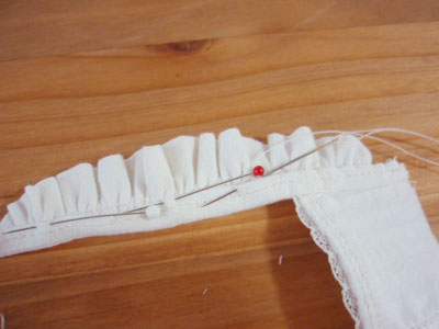 フリルと肩ひもの合い印が合うようにギャザーを整えてぬいつけます。