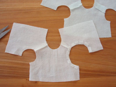 袖ぐりをぬい合わせたらぬいしろには切り込みを入れ、巾を半分にカット。