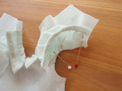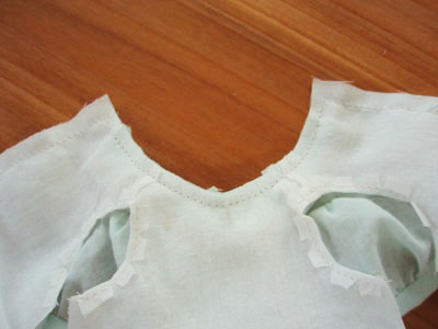 ↓えりぐりのぬいしろは半分くらいの細さにカットし、カーブに切り込みをいれて、ぬいあわせた部分を表に返し、アイロンをかけて形を整えておきます。