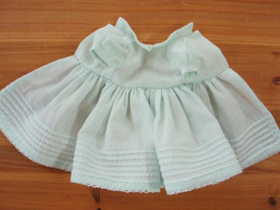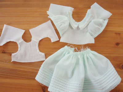 スカート部分は、この時点でほぼ完成形にしておきます。お好みで裾にレースをたたきつけ、脇と裾は三つ折りステッチ。