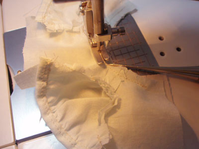 ぬいはじめは後ろのフリルつけ止り。からスタートして外側をぐるりと、ウエスト位置までぬいます。