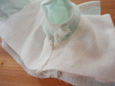 ↓その後裏地の脇をぬい、袖ぐりをまつりぬい。