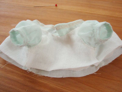 表見頃の袖ぐりと合い印を合わせてぬいあわせます。※とても小さくてぬいにくいので、しつけをしておくと安心です。ここだけ手縫いにしてもいいと思います。