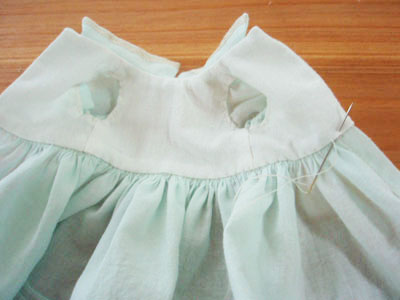 スカートにも裏地をつける場合はウエストのギャザーは裏地と表地を一緒にギャザーよせします。