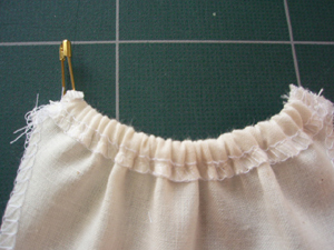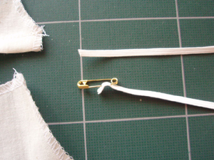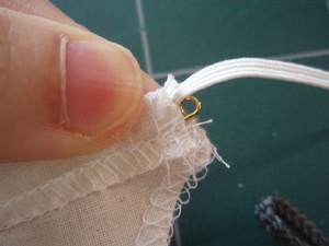 すそにゴムを通します。ゴムの端に安全ピンを刺し…
