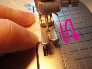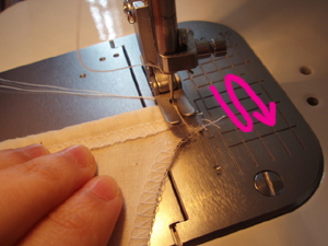 ゴム端と通し口を返しぬい。ゴム通し始めと同様です。