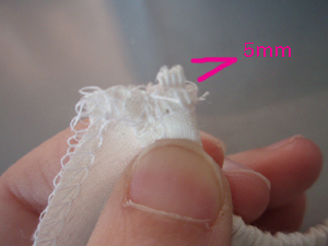布の端から4mmくらいを、ゴムが抜けないようにしっかりと返しぬいします。