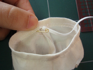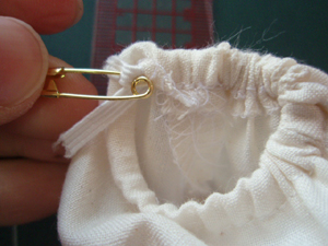 ゴム通し口から、安全ピンに刺してゴムを通します。