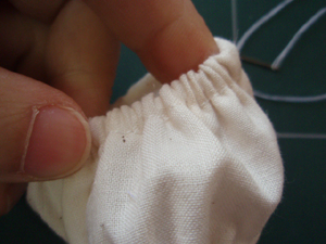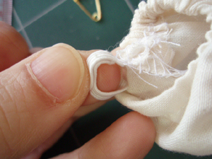 (途中でゴムがねじれてしまっていないか、ぬい止めるまえに確認してください。)