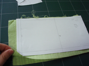 型紙を切り抜いたら、使用する生地を中おもてにして、上に型紙をのせる。