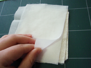 その後、カットした2枚(表地2枚、裏地2枚)をそれぞれ中表に重ね、地の目をそろえて重ねる。