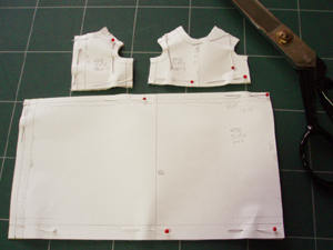 後ろ身頃は左右対称に1枚ずつ必要なので、まず身頃のパターンが取れるサイズに2つに布をカット。