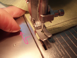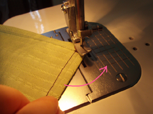 後ろ端の裾の角まで来たら、また同様に、針が刺さった状態で押さえ金を上げ、くるっと90度回転させて向きを変えます。