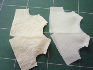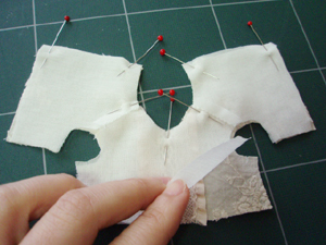 5,身頃の前立てレース付け 6,身頃組み立て 7,身頃を表にひっくり返す 8,身頃とスカートを縫い合わせる 9,裏地を手まつりぬい〜仕上げ